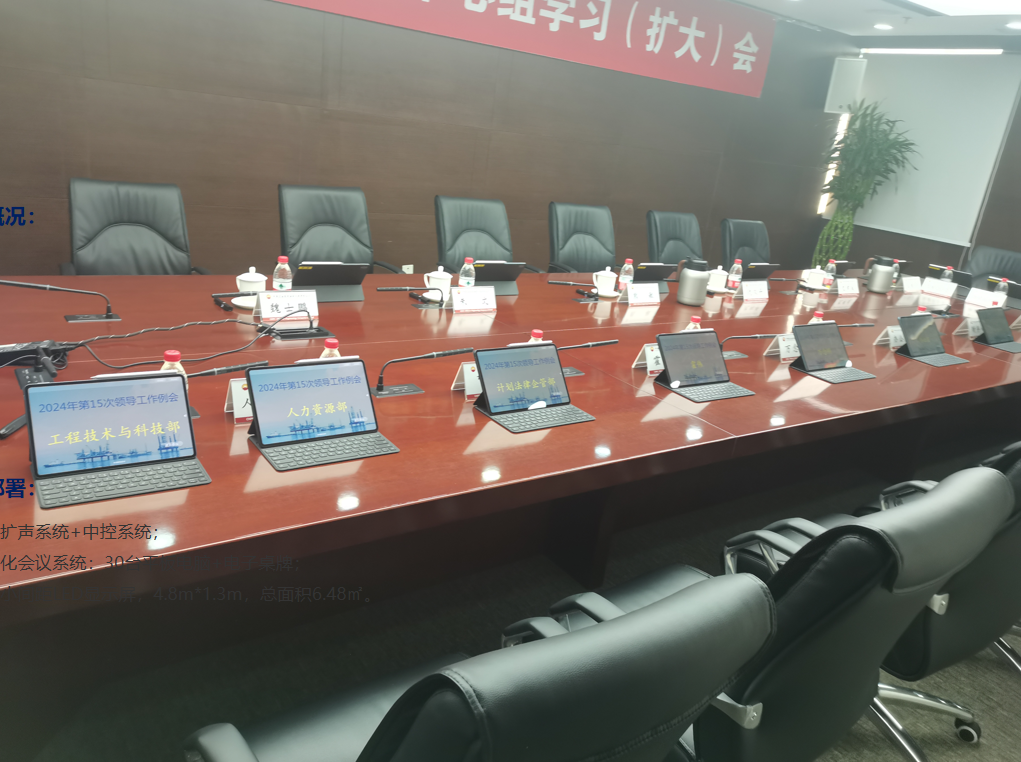 2. 無紙化會議系統:30臺平板電腦+電子桌牌;3. P0.9小間距LED顯示屏,4.8m*1.3m,總面積6.48㎡。