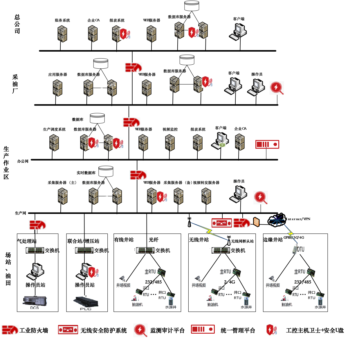 在采油廠、作業(yè)區(qū)、場站油井邊界及作業(yè)區(qū)區(qū)域邊界位置串聯(lián)部署工業(yè)防火墻,對各層級用戶和外來的訪問進行控制,保障采油廠、作業(yè)區(qū)等重要生產(chǎn)區(qū)域網(wǎng)絡(luò)的可用性和安全性。